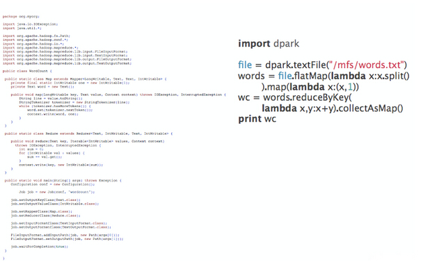 DPark顾名思义是Spark的Python实现,不过现在已经跟Spark越来越不一样了。和 Hadoop 相比,Spark可以使用内存做为缓存加速分布式计算,DPark继承了这个优点,这对于大规模数据的迭代计算非常有用。在豆瓣的应用场景下,因为我们的离线计算很多是推荐算法计算,这种计算涉及大量的迭代算法,如果每次计算的结果都入磁盘再在下一轮计算加载,那性能是很差的,所以DPark能够大幅提升性能。另外,因为DPark的编写使用了函数式语言的特点,所以可以写的非常简洁:
