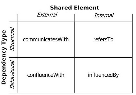 根据Callos等人在这篇论文中的内容所说,基本的架构依赖类型共分两种:即结构型依赖和行为型依赖。结构型依赖包括了软件包、服务或其它类型的API之间的链接,而行为型依赖包括了界面验证逻辑,或是以上的示例中所说的货币四舍五入策略。我们可以将这两个基本的依赖类型与共享元素相结合,正如下图中所描绘的那样。