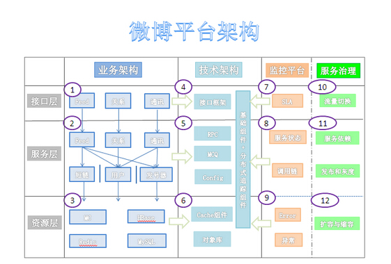 微博平台的第三代技术体系,使用正交分解法建立模型:在水平方向,采用典型的三级分层模型,即接口层、服务层与资源层;在垂直方向,进一步细分为业务架构、技术架构、监控平台与服务治理平台。下面是平台的整体架构图: