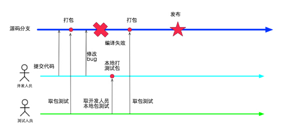 工程的架构决定了研发交付的流程,所以当时的流程也比较简单,开发人员在本地开发完成以后直接提交代码,然后编译服务器进行打包,出包以后测试人员进行测试,如此反复,最根据代码库的最后一次提交进行发布。如下图所示: