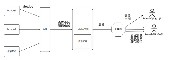 工程架构是整个研发的基础,所有的事情还是要从工程架构讲起。为了能够接入越来越多的业务,手机淘宝的架构从之前的单一工程的方式演进为模块化开发的方式,每一个模块被称作bundle。同时引入了仓库的概念,每个模块将源码打包之后deploy进入仓库,然后由builder工程进行依赖管理并编译打包。