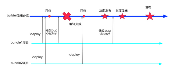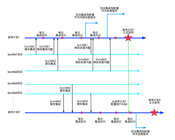 由于架构改造,提交集成的角色从开发人员变成了业务模块的研发团队,提交集成的方式从提交代码变成了deploy到仓库,但是由于工程架构的问题本质上没有完成各个bundle的解耦,所以整个团队还是在一条线上进行开发。不过这各阶段加入灰度发布的概念,灰度制度的建立使很多问题提前暴露,从而提高了正式发布版本的质量。