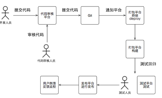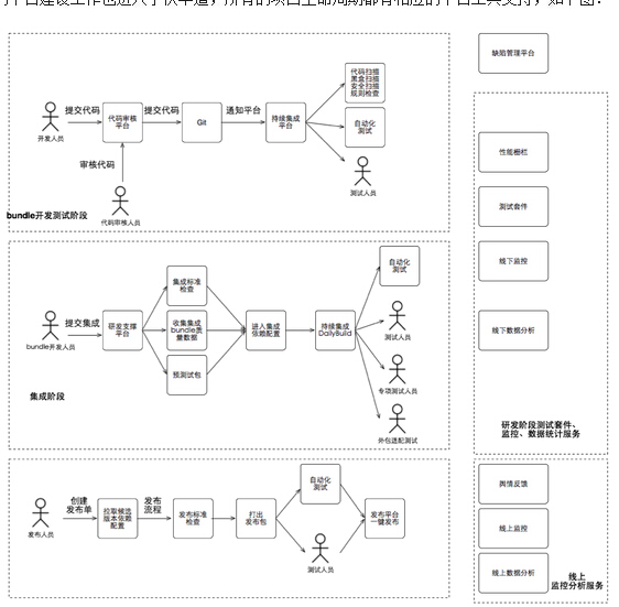 另外这个阶段建立起了代码审核、打包平台、发布平台、测试平台、舆情监控平台等,自动化了很多事情,在一定程度上提升了工作效率,大致使用流程如下: