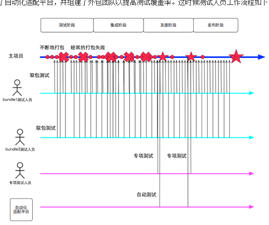 这个时期的手淘测试团队建立了内存、性能、流量电量等专项测试机制,编写了一些半自动化的测试工具,建立了自动化适配平台,并组建了外包团队以提高测试覆盖率。这时候测试人员工作流程如下图:
