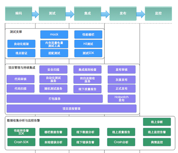 有了工程架构的有力支持,研发流程慢慢进入了正轨。首先明确了bundle开发、提测、集成、灰度、正式发布等各个生命周期的边界,真正做到各个阶段的相互独立。其次在各个生命周期中加入了规范性的流程,并由平台保证了流程的真正实施。最后质量保证手段和效率也有了很大提升。基于以上几点手淘的整个研发做到了类似于火车发车的发布过程:
