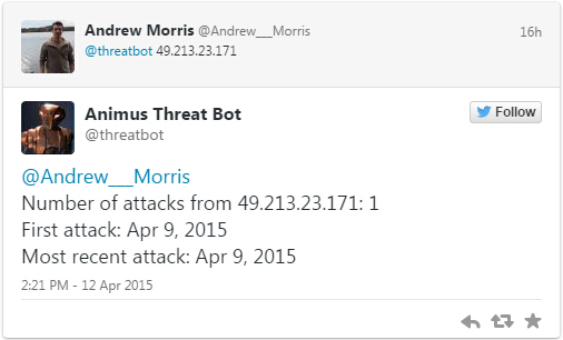 去年,我创建了一个叫Animus的系统,概括地说,这是一个智能化的系统,发现并举报一些互联网非法人员的所作所为,并免费发布数据,目前,该系统已发现超过10000名攻击者的IP,确定了数百个恶意软件的command and control(C2)服务器,截获了无数的恶意软件样本和黑客工具,并观察到对网站服务仍有数以千计的攻击。
