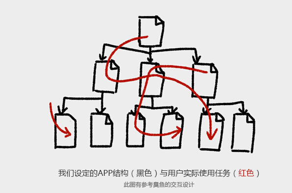 APP解构后的各个模块及页面自己的内容、工具、操作如何通过组合来更好的吻合用户任务,是交互设计师发挥的地方之一。常用的手法是用户研究,去研究自己设想的目标用户,其实获得这些数据和结论后要用在结构上同样需要费一番心思,相当于准备了做菜的材料和知道了吃饭人的口感偏好之后如何把菜炒出来。