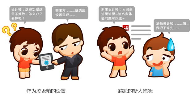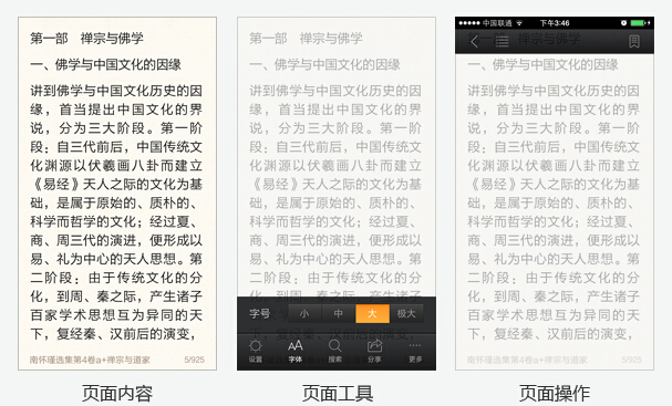 组合各个模块和布置页面内容、工具、操作。云阅读4.0版本的模块的结构有好几个方案,最后用的是最大众化的底部导航,用户熟悉这种交互方式是选择此方案的原因之一。教育用户这种事就像第一个吃螃蟹的人——付出的多收获却不一定丰厚。米聊大家还记得莫,国内移动互联网即时通讯最早期试水者,微信将其秒杀后,模块结构却基本被沿袭下来(当然了也可能是巧合);再比如下拉刷新这个已经全民皆知的习惯,最早来自Twitter,而且也获得了专利,现在APP中遇到列表页需要刷新内容时不用下拉刷新试试?这种页面工具咱们大可不必去创造新轮子。在所有的APP里“设置”模块其实像一个垃圾桶,设计师觉得不重要又不好去掉的东东都在里面堆积(相对来说产品经理更擅长做这件事),这样做的好处就是用户的任务实在走不下去了设置可以来弥补,用户用的不舒服却没其它办法时就会来设置里淘淘宝试试运气(从用户反馈中可以看到这些习惯),所以页面工具在设置中基本都要有,正文页有夜间模式工具、设置中也要有,设计时诸如此类往往需要照葫芦画下来。