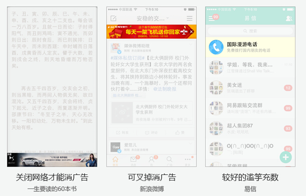 就是让用户看着这个产品很顺眼、很好用,但是里面确实有产品植入性的东西。比如云阅读的猜你喜欢模块,在用户读完一篇文章和每个订阅源详情后都跟着猜你喜欢。这些推荐都是追随类型相关性出现的,如果你正在阅读的是三胖干掉姑丈的新闻,我们就会猜你喜欢早期三胖机关枪扫射银河乐队这类事件。当然,滥竽充数让用户识破的例子也很多。很多APP中的页面底部广告就是典型例子,这个页面操作让人不惜关掉网络以换取安静纯粹的看书;云阅读首页右上角总是挂一个消息提醒的Icon(属于页面操作),碰巧如果你的邮箱悲催的被各种垃圾邮件干扰,这个Icon会不厌其烦的给你弹出气泡,这个气泡对你其实没什么用,因为你不care这些邮件,然后很多用户就来询问哪个地方有个关闭通知的按钮(反馈系统看到的)。有时候滥竽充数没做好的同时设计师还不忘给用户闪个Tips,仿佛吼着说“看,我在这儿”,鬼才愿意看到。新功能Tips提醒也是同样讨人厌的滥竽充数,更新或下载一个APP后总是各种提示诸如“点击这个发布动态、这里添加好友”,真的等用户任务到了要用此模块且不知道怎么办的时候,结构确给不出回答。另一个场景是这样的:你选择用扫一扫加一个朋友的微信,到“添加好友”模块却找不到扫一扫,而对方此时虔诚的举着个二维码略带蔑视的看着你,经过一番周折你可能终于在“发现”模块里面找到了扫一扫(也可能换其它方法),双方一阵啧啧,你内心估计会嘀咕一下微信:这是咋整的!我们避开业务层面的(扫一扫功能增多了)讨论这个现象,用户的任务确实就是在“添加好友”时需要用到扫一扫,这就是说,这个悄悄移位的的举措一下子就让用户感觉到不适了。