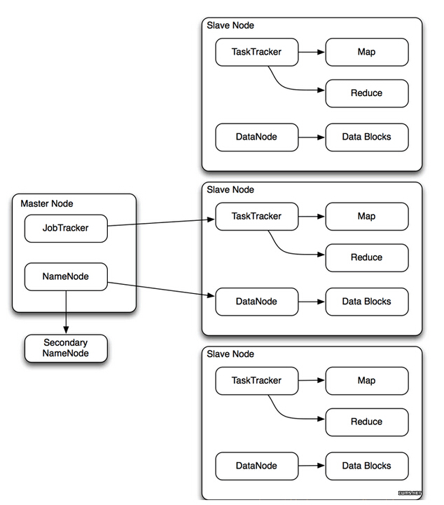 图1显示了主节点与从节点之间的关系。主节点包含两个重要组件:NameNode,管理集群及负责所有数据;JobTracker,负责管理被执行的代码和所有TaskTracker守护进程。每个从节点都有TaskTracker守护进程和DataNode守护进程:TaskTracker从 JobTracker处接收指令并执行map和reduce步骤,而DataNode从NameNode处接收数据并管理被从节点包含的数据。并且理所当然存在一个Secondary NameNode监听NameNode的更新。