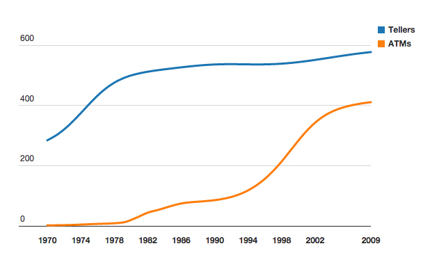 聪明的机器接手人类任务,工作机会消失,这可能看起来很明显。根据《60分钟》的报道,“银行柜员被ATM机取代,售货员向电子商务投降,电话接线生和秘书被语音识别技术取代”,但事实并非如此。ATM机并未取代银行柜员,恰恰相反,因为银行支行需要的柜员减少,银行便开设更多支行,而银行柜员的总数增加。