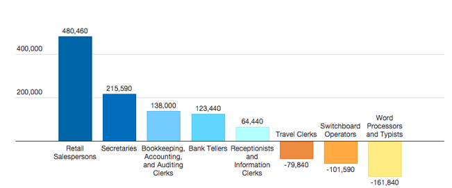 在过去10年里,零售记账人员和秘书数量增加,接线生数量减少,但前台接待数量增加。