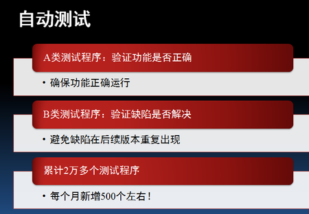 以前软件测试往往聚焦在软件测试方法上,包括单元测试之类的,实际上任何事当规模大到一定程度,本身也会由量推演到质变。“超图早期时,研发有个非常明确的岗位叫软件测试工程师。而现在超图研发中心里已经没有这个岗位了。以前软件测试工程师就是做软件测试,大量的工作是拿鼠标点、拿键盘敲,测试软件的响应,也就是结果是否正确。而现在,测试工程师的职责发生了非常大的转变,现在测试工程师已经不像以前那样工作了,是编写测试程序。现在软件测试工程师已不再是以前那个意义上的软件测试工程师了,他本身也是一名软件开发工程师,只不过他做的开发是测试用例开发也就是测试程序的开发。” 李绍俊解释说500多万行代码靠人工点不过来,覆盖不过来,肯定有漏掉的一些领域。现在软件测试已经不再单纯依靠人工的测试,而要依靠自动化的测试。