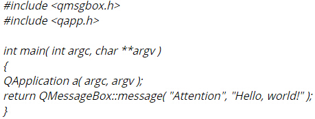 - Qt下的"hello world"应用程序只需要8行C++代码: