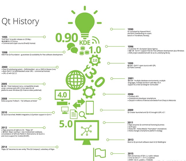自从Qt(标准发音同cute /kju:t/,你读对了吗?)第一个工具包发布以来已经有20年了,经历一个有趣的发展过程:Trolltech、Nokia、Digia和如今拆分的Qt公司。