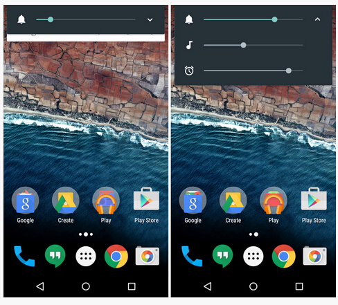 Lollipop的“顶端通知”机制会在屏幕上方弹出通知内容,虽然效果不错但却缺少用户控制功能。Android M就这一点作出了改进,用户能够以各应用程序为基础对其进行分类,这肯定会让很多使用者欢呼雀跃。在正式上线之前,开发人员会通过实际体验来证明这一机制到底是否有其意义,当然每一位开发者的意见都很重要。此外,现在我们也能够轻松控制Android的三种不同音量滑块(分别为通知、媒体与闹钟),在新型下拉菜单当中、三者被合并成一体并加以显示。