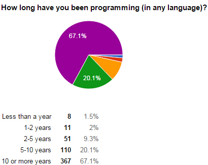 虽然有些人会认为一个像F#这样的语言,那些经验丰富的开发者会回避它,可调查结果表明并非如此,因为报告中有67%的被调查者的编程经历是10年或10年以上的,所以这表明老开发者没你想象的那么保守。Wlaschin在信中说到。