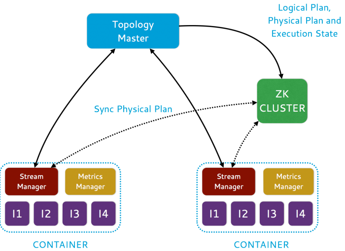 对于Heron的整体架构请看图1和图2。用户使用Storm API来构建和提交topologies来实现一个调度。调度运行的每一个topology作为一个job,有几个容器组成,其中一个容器运行主topology,负责管理topology。每个剩余的容器运行一个流管理器,负责数据路由——一个权值管理器,用来搜集和报告各种权值和多个Heron实例(运行user-defined spout/bolt代码)进程。这些容器是基于集群中的节点的资源可用性来实现分配和调度。对于topology元数据,例如物理计划和执行细节,都是保管在Zookeeper中。
