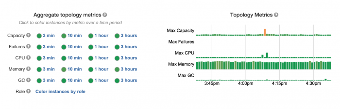 Easy debugging:每个任务是进程级隔离的,从而很容易理解行为、性能和文件配置。此外,Heron topologies复杂的UI如图3所示,可快速和有效地排除故障问题。