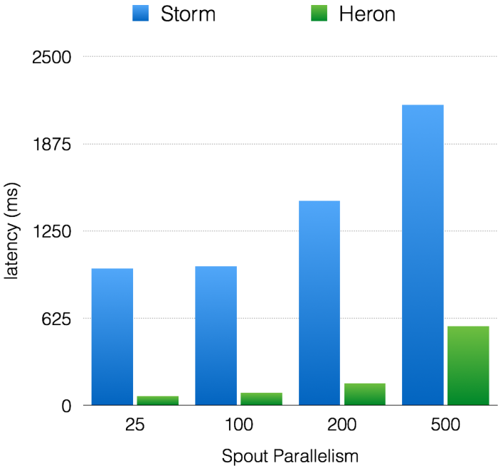 如图4所示,Heron和Storm的吞吐量呈现线性增长的趋势。然而,在所有的实验中,Heron吞吐量比Storm高10–14倍。同样在端至端延迟方面,如图5所示,两者都在增加,可Heron延迟比Storm低5–15倍。