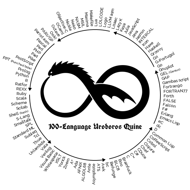 一方面,这种比赛和各种体育竞技比赛一样,能挑战极限。因此很多高手都乐此不疲,IOCCC历史上获奖者就包括Perl创始人Larry Wall,D语言创始人Walter Bright,Ruby现在的核心之一Yusuke Endoh(他写过好多奇奇怪怪的编程语言,主流编程语言编译接力贪吃蛇程序Quine Relay可是令人叹而观止啊,见下图,现在已经支持100种语言了),《代码阅读》一书的作者Diomidis Spinellis,还有大神Fabrice Bellard。