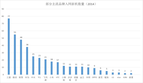 在2014年新上市的全部1604款Android手机终端中,在工信部备案的主流品牌终端有407款,其中三星、小米、华为等12个主流品牌的终端出货量,已经占到2014年总出货量的72.42%。如果再算上诸如努比亚、锤子手机、一加手机等品牌,那么这个数字将达到95%。