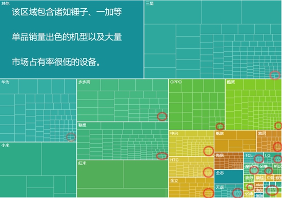 图中每个小的矩形碎片,代表该品牌下的某一款型号的设备在国内的市场占有率。单个碎片面积越大表明其单品占有率越高,比如三星Note II和小米的MI 3,分别在该视图上占据面积超过4%。如果游戏在这两台设备上不兼容,那么就会直接失去8%的市场占有率。优先适配这样的设备性价比更高,而图中圆圈内大量的碎片面积很小,这意味着实际上即便主流品牌下仍然有大量智能设备实际的市场占有率极低,对于这部分机型可以不做适配。