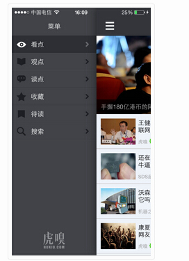 虎嗅APP的主界面除了内容区域,最为突出的就是logo,一个汉堡菜单按钮和一个个人中心的按钮。首先对这款APP的汉堡菜单,进行一下简单的初体验。