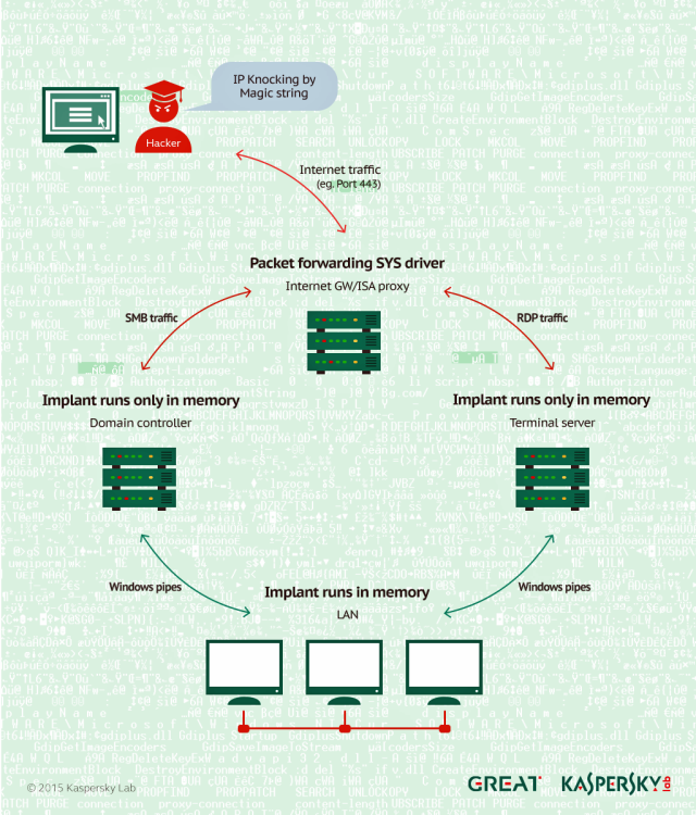 我们来看看技术上的细节。下图是卡巴斯基技术报告(PDF)里的框架性概念图。
