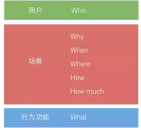 2)对于场景的思考,你可以从上图的5个方面去提问,用户为什么会用,能得到什么好处?什么时间来使用?在哪使用?是方便的使用还是寻找乐趣?使用的成本是?使用的时长是?使用的频率是?不一定5个方面的结果对于产品设计都有意义,但这五个方面可以帮助你全面的思考。