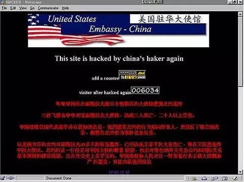 一切得从1999年说起,那一年我国驻南联盟大使馆遭到美军导弹攻击,中国网民立刻在网上掀起了抗议浪潮,中国黑客无法忍受同胞被害、使馆被炸、民族尊严遭到侵犯,对美国驻华使馆、白宫及美国和北约的众多网站展开了持续多日的猛烈攻击,白宫网站从5月8日晚起便遭到多次修理,甚至主页上的星条旗也被替换。