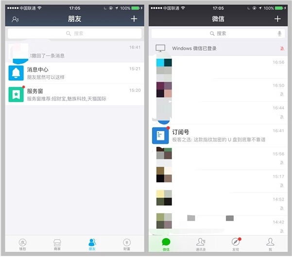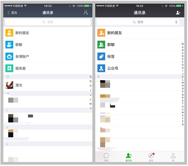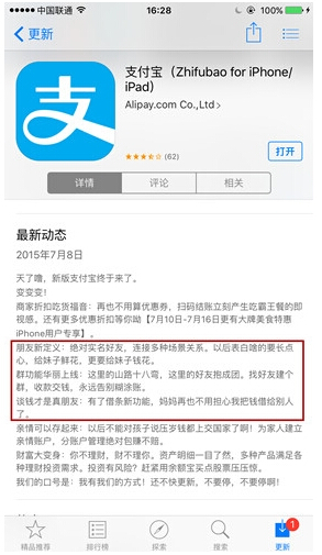 首先是支付宝的图标变成了蓝色,这对于那些强迫症患者来说可要给它安排一个新地方了,可以看到在更新详情里面可以看到支付宝对朋友功能进行了新定义,还上线了群组功能,当然更新好进入才发现实在是让人大跌眼镜。下面图片均是左为支付宝截图,右为微信截图。