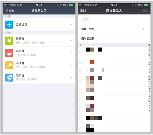 那么右上角的几个功能呢?支付宝果然没让我失望,除了收钱功能也是照抄不误,添加朋友、发起群聊和扫一扫功能一应俱全。不过建群增加了一个特色群功能,可以将群的主题选为吃货群或者娱乐群等。