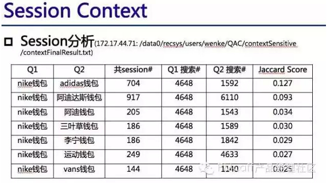 如果用户搜索了“nike钱包”,在下一次搜索中会搜 “adidas钱包” 的概率是704/4648 = 15.1%; 如果用户在下一个Query中输入 Adidas 应该提示 “Adidas 钱包”,同时去观察同session下用户的数据,需求是有趋同的意图,类似这种: