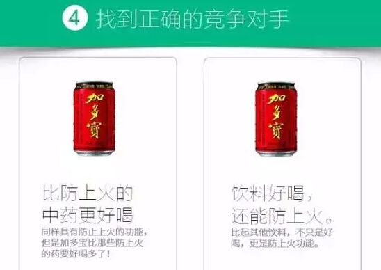 比如上图中,我假想的上述两种加多宝凉茶的文案,前一种是跟预防上火的中药比,虽然更加突出了“防上火”功能,但是人觉得“是药三分毒”,可能不敢喝;后者跟饮料比,增加了“防上火”功能,给人感觉“不再为喝不健康饮料而有负罪感”了。