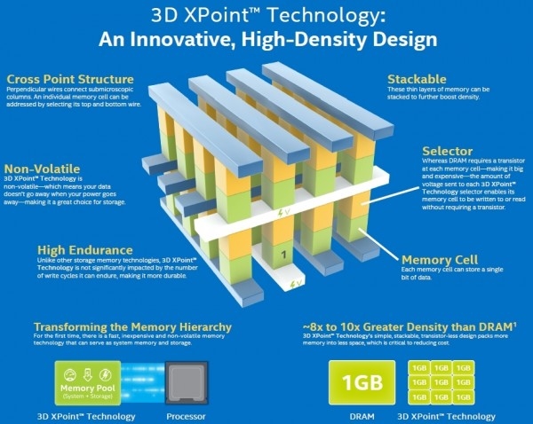 两家公司宣称,3D Xpoint(读法是crosspoint)是内存技术自1989年NAND闪存以来几十年最大的突破,产品结合了NAND闪存和DRAM之长,与传统闪存技术相比,容量更大、速度更快、成本和能耗更低、寿命更长,而且已经可以投入生产,明年相关的方案产品就能上市。