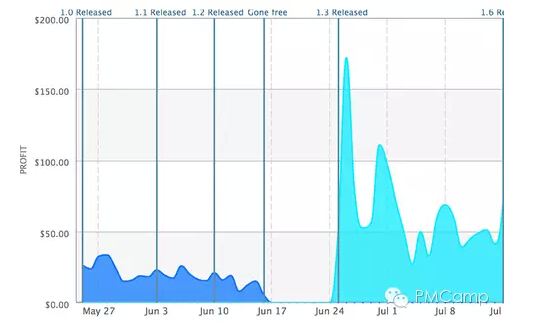 在实验过程中,我分别用 0.99、1.99 和 2.99 美元定价,每种价格持续一周。但从收益图表上来看,应用销量变化不大。价格的上升或者下降都被购买数量的变化抵消了。