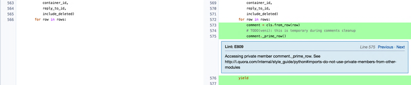 我们开发了一款叫做“qlint”的内部使用的代码校验器,用来减少那些惹恼人们的麻烦。Qlint是一个“聪明的”代码校验器,既懂得文本,也理解结构,还能处理AST,它是基于flake8和pylint开发的。设计qlint的初衷是让以后添加自定义的lint规则变得简单。比如,我们遵循的一个规则是:Python所有的“私有”变量之前都应该有一个下划线,所以我们在qlint中增加了一个规则,这个规则可以检测所有没有加下划线的私有变量,并判定为“非法”。