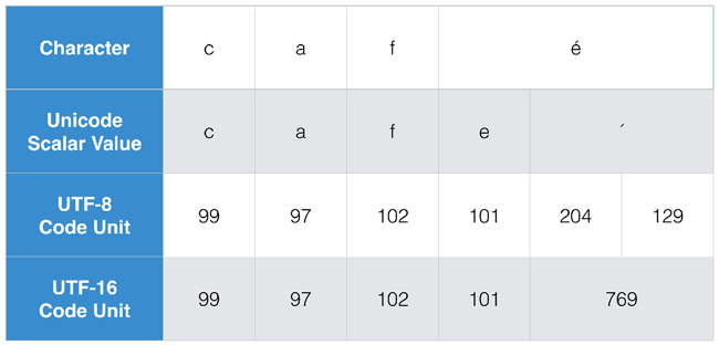 characters属性段的文本扩展字形集群,这是一个近似的用户感知的字符(在这种情况下,c, a, f, and é)。因为一个字符串必须遍历它的每一个位置(每个位置称为一个代码点),为了确定字符边界.访问此属性的线性输出O(n)时间。当处理字符串包含人类可读的文本,高级语言环境敏感的Unicode编码算法,尤其使用localizedstandardcompare用(_:)方法和localizedlowercasestring财产,应优先采用字符处理的特点。