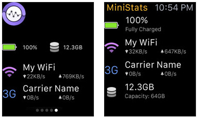 iOS 9添加了在推送中心查看手表电量百分比的功能。Apple Watch版MiniStats允许用户在手表上浏览手机信息。当你能通过轻敲手表上的闹钟查看网络状态,电量百分比诸如此类的,还有必要从口袋里掏出手机吗?Apple Watch版的MiniStats也极具每个Apple Watch佩戴者值得拥有的实用性。