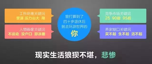 第二个关键词是人物画像。40岁我们到底是什么状态呢?也许那时候我们还是北漂,没有户口,可能是一个秃顶的中年男人,或者邋遢的中年女人,哦对了,还随身携带游泳圈。这是多么残忍的画面!