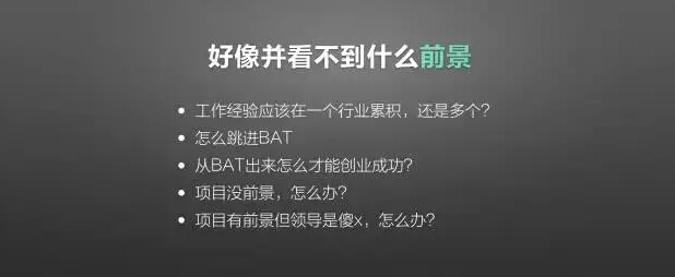 但说到项目前景这件事,可能很多人就有共识了。不是每个人都对项目的发展和方向有认知。而当我们真的遇到一个有前景的项目的时候,又有很大可能会遇到一个傻x的领导。看台下大家都在笑,应该在这个问题上有很多共识。跳槽太频繁不是好事,有的人会从一个行业跳到另一个行业,彼此之间没有太多关联。上次很多人加我微信,问腾讯还要人吗?我觉得很难过,大家都很想跳进BAT吗?其实在BAT里面的人并不会觉得BAT有多么好,BAT的人天天都在琢磨从BAT跳出来之后去哪儿创业。
