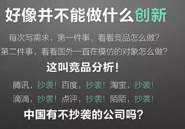 第三:好像并不能做什么创新。在我们平常的工作里,我最常看到的一个场景,是一写产品需求,第一件事情就是看一下竞争对手怎么做。第二件事呢,看看国外类似的产品怎么做。美其名曰,竞品分析!这真的是竞品分析吗?竞品的分析,就是把竞争对手是怎么做的,拿过来抄一抄吗?大家愤青一点,就会在各种论坛上骂,中国有不抄袭的公司吗?中国适合创新吗?创新产品在这里有什么作用?
