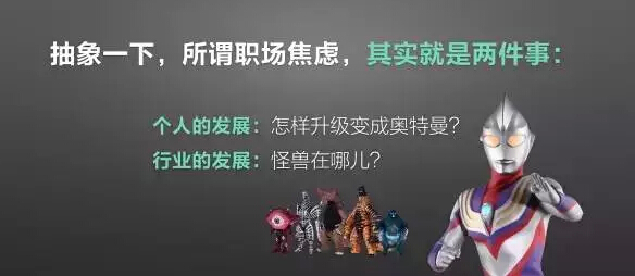 在职场,你需要考虑两件事。第一件是清楚知道个人发展,通俗点说,怎么样变成奥特曼?第二个是清楚知道行业发展,怪兽在哪儿?