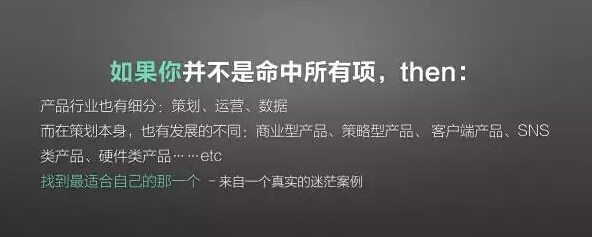 当然,最重要的是找到自己最适合的,比如策略型产品其实需要跳跃能力不会很强,要的是非常强的数据挖掘能力和推理能力,逻辑要非常严密,非常精确,这样才能够和团队有非常好的配合,把整个策略做得非常好。所以,大家需要对自己正在从事的产品行业,有一个很清晰的认知。尤其在我们刚刚踏入职场的时候,一定找到最适合自己发展的细分市场,就像产品一样,基调对了,后续才能有更长久的发展。