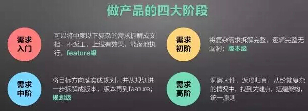 最后说一下阶段篇,我们做产品的每个人都需要很了解自己当前处于一个什么状态,而且知道下一个阶段是什么样子,这样就有一个很清晰的目标,才会更好的提升。在这里对产品阶段做一个总结,分成四个阶段。