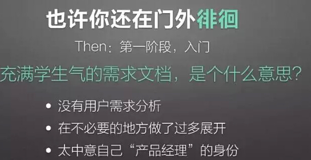 第一个阶段需求入门。一般是从业1到3年的产品经理,能够把中度以下的复杂需求拆解成文档,关键问题不返工,上线以后这个点子有效果。特别要注意一下,我在这里说到的是结果有效,而不是过程的衡量。