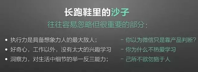执行力是具备想象力人的最大敌人。执行是非常重要的事情,大家很多时候提到微信都说产品怎么讲,怎么样,我强烈建议大家拿微信最早的发版时间表对一下,研究一下那个时候,微信团队是以一种怎样的版本姿态,与市场争分夺秒的。执行力是一切工作的前提,没有这个,不要去提产品设计。有好点子怎么样,没有执行力一切都是空谈。