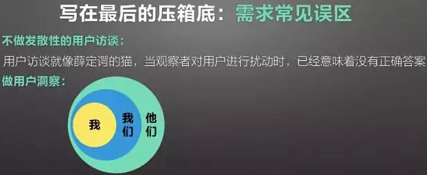 还有一个需求常见误区是不要做发散性用户访谈,用户访谈像薛定谔的猫,当观察者对用户进行扰动时,已经意味着没有正确答案。大家回头看一下薛定谔的猫的详细理论,在这里不赘述。用户层面也要做洞察,我是一个圈,我们之外还有一个圈,由于人性天然的排他性,我们会在潜意识中忽略掉非自己的同类——他们。对于广大用户来说,都是被你划在我们这个圈之外。