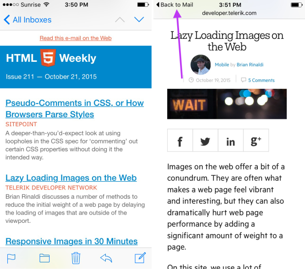 最后一个例子:在一个应用中进入某个链接时,iOS9状态栏里那些便捷的文字按钮就会适时出现。如果点击邮件中的链接,会启动浏览器,然后显示页面。轻轻再点一下就会返回到邮件应用中。虽然仍需要在应用之间切换,但无需经过主屏或显示“在运行的应用”的屏幕,过程更加严丝合缝,一气呵成。